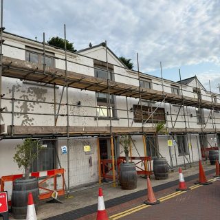Erection of scaffolding, anti-fungal wash down, render repairs and redecoration to lime render using mineral based paints.